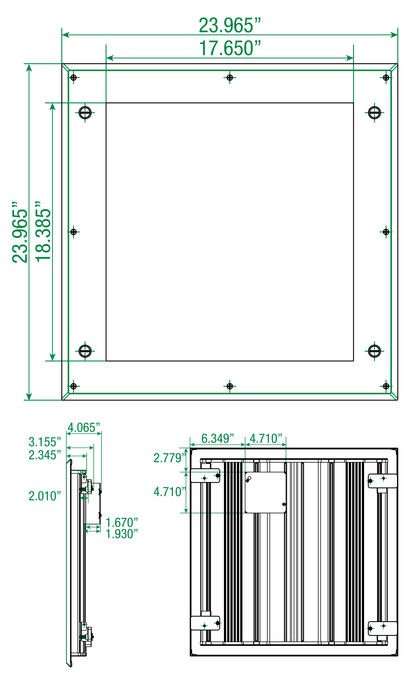 Housing: Low-profile (2.0”) extruded aluminum housing with die-cast aluminum end caps. Extrusion profile produces internal heat sink and external heat fins to conduct/dissipate heat away from LED junction point to the housing exterior. Housing will support 1,000 pounds for walkable ceiling applications.